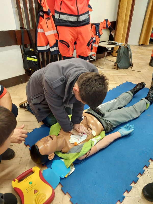 Součástí programu byla také instruktáž správného volání na tísňovou linku 155 a praktické ukázky první pomoci, do kterých se žáci aktivně zapojili.