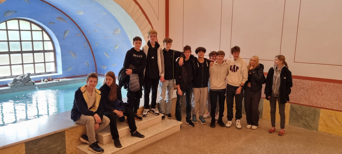 Vrchol prohlídky nás však teprve čekal. Lázně. Hned u vstupu jsme uviděli vyskládaná metrová polena, kterými se prostor lázní vytápěl. V první místnosti jsme si prohlédli průřez podlahou, abychom pochopili systém římského podlahového topení, a pak už jsme si jen užívali postup z chladnějších místností (frigidaria) do té nejteplejší (caldaria). Testovali jsme teplotu vody v bazéncích i teplotu podlah, obdivovali jsme nádhernou výzdobu stěn i stropů, vyzkoušeli jsme lehátka a hluboce jsme se skláněli před důmyslností, vynalézavostí a zručností starých Římanů. Někdo z účastníků zájezdu prohodil, že to byli borci – a měl pravdu.