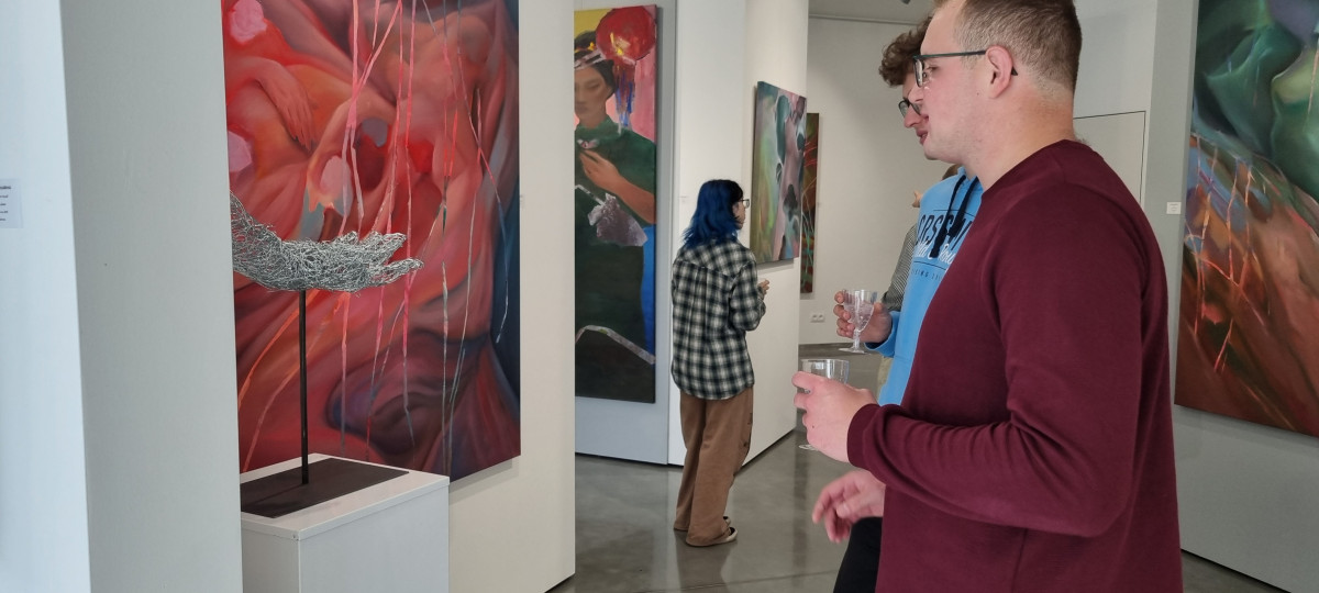 Ve středu 17. 9. 2025 v deset hodin dopoledne přivítala majitelka galerie, úžasná paní Ingrid Kitbzbergerová, hosty (PO2) a předala slovo kurátorce výstavy (Adéle), která přítomné seznámila s tématem propojujícím tvorbu dvou vystavujících autorek. Malířka (Patrika) i sochařka (Áďa) představily ve zkratce své práce, a pak už hosté se sklenkou vína (zn. Mattoni citronová) procházeli mezi obrazy a sochami. Díky zájmu návštěvníků se vernisáž zvolna proměnila v komentovanou prohlídku pod vedením paní Ingrid. Nádhernou atmosféru umocnil hudební doprovod kytaristky Sáry a sluníčko, které zpříjemnilo prohlídku v zahradě galerie.